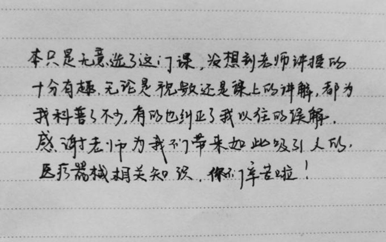 学生课程评价:在此次实践中,作为小组长,我锻炼了组织能力、决策能力,作为文案整理员,在整理文案的同时也认识了不少医疗器械,增加了我的知识面。非常感谢小组成员的积极参与,让我认识了优秀的他们。通过学习这门课,我发现其实医疗器械涉及的面很广,将其他领域的知识和医学知识相结合起来,就可能会有新的发现或可以制造出新的医疗器械。知识是相互交融的,我们受益匪浅。