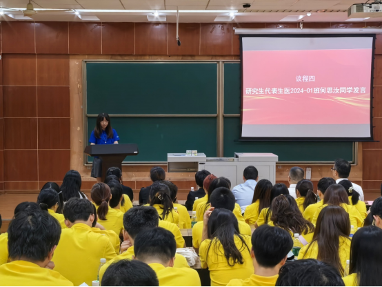 随后,2024级生物医学工程1班的何思汝同学作为在校生代表发言。她分享了自己在医学院学习和生活的点点滴滴,以及对未来的憧憬和规划。她的发言洋溢着青春活力与对未来的无限憧憬,激励新生勇敢追梦。