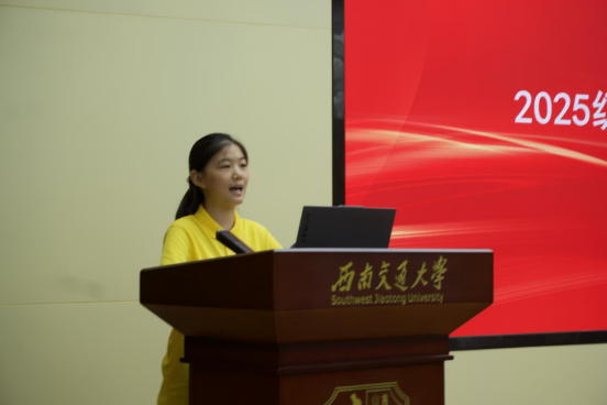 2025级新生代表陈若男讲述自己因家人患病而立志投身生物医学工程的故事。她动情地说:“那小小的支架,宛如一道希望的曙光,穿透了黑暗,为父亲的生命重新注入了活力,也为无数个像我这样的家庭架起了通往幸福的桥梁。正是这次经历,让我深刻感受到了生物医学工程的神奇与伟大,也在我心中种下了一颗坚定的种子——我要学习生物医学工程,用知识和技术守护更多人的生命健康。”