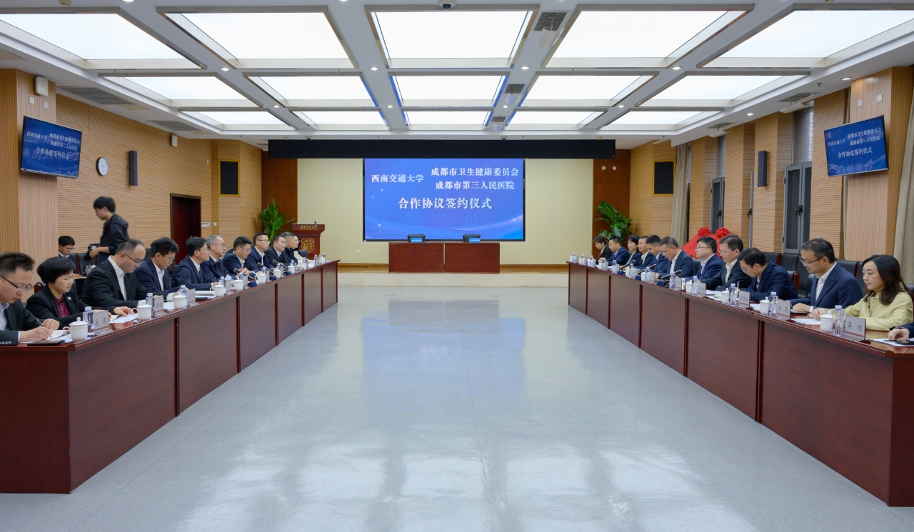 10月20日,西南交通大学、成都市卫生健康委员会、成都市第三人民医院合作协议签约及授牌仪式在犀浦校区举行。成都市卫生健康委员会党组书记、主任杨晓涛,党组成员、副主任白兰彬,成都市第三人民医院党委书记吴奎,党委副书记、院长刘早阳,学校党委书记余敏明,校长闫学东出席仪式。学校党委常委、副校长刘长军主持仪式。