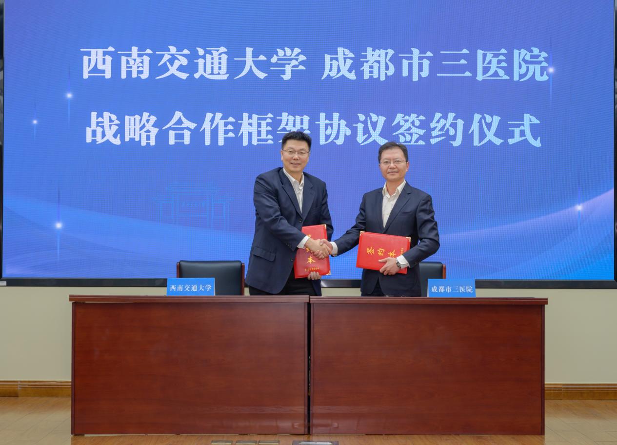 闫学东、刘早阳代表双方签署西南交通大学与成都市第三人民医院战略合作框架协议。