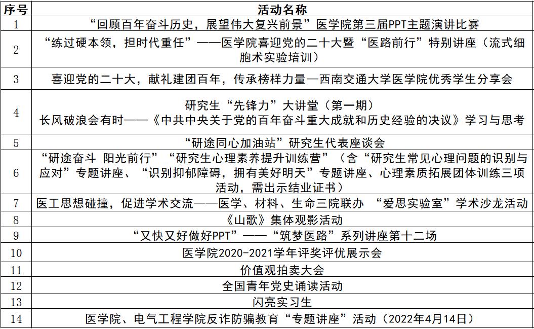 现将学院2021-2022学年计入日常行为分的集体活动进行如下公示,如有其他活动申请计分,提交申请材料后统一由学院奖励评审委员会审核。