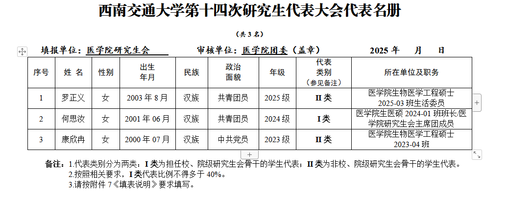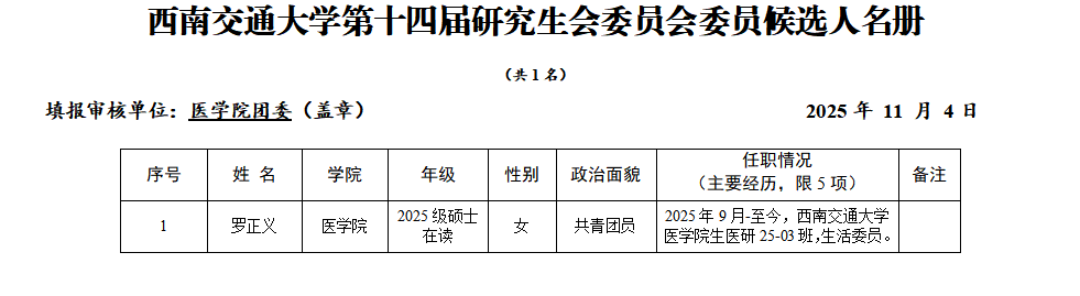 根据《关于做好西南交通大学第十四次研究生代表大会筹备工作的预星空web版登录入口》,经班级(团支部)推荐,充分酝酿,共选举出研究生代表3名;经学院团组织提名,经班级(团支部)推荐,学院团组织考察,推选出研究生委员会委员候选人1名。现将代表选举结果、委员候选人推举结果公示如下,公示期2025年11月4日-11月7日,如有异议,请于2025年11月7日17:00前至医学院206办公室反映。