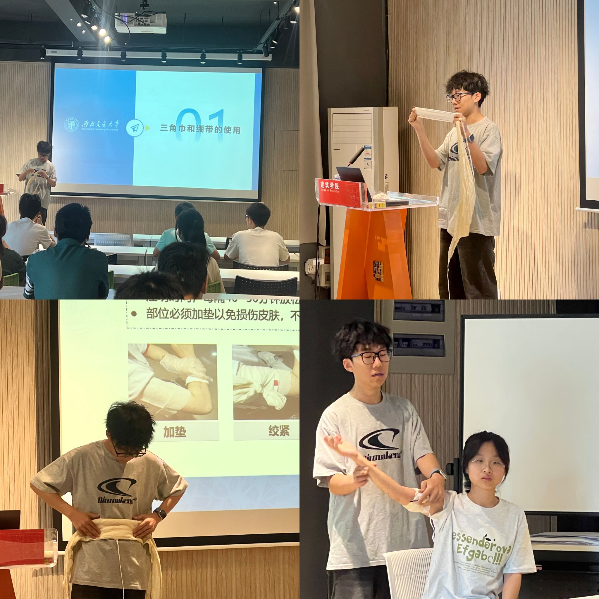 5月25 日上午10:30,由医学院与建筑学院承办的第二期活动,在犀浦校区报告厅A100(八教一楼中庭)准时拉开帷幕。活动邀请到红十字会学生分会副会长邓宇为同学们进行急救知识与技能培训。培训内容涵盖心肺复苏、自动体外除颤器(AED)使用、创伤急救等核心技能,采用理论授课与模拟演练相结合的方式,让学员们在掌握理论知识的同时,能够在实践中提升操作能力。授课老师首先详细讲解了三角巾和绷带的多种使用方法,包括环形包扎、螺旋包扎、“8 字”包扎等,针对不同的创伤场景,深入浅出地介绍了每种包扎方法的适用情况和作用。随后,通过视频演示和现场示范,细致地展示了心肺复苏的整个流程,从判断现场环境安全到胸外按压、开放气道、人工呼吸等每一个步骤,都进行了详细的讲解,并强调了操作过程中的注意事项。在模拟演练环节,同学们积极参与,在专业指导下进行实际操作,亲身体验急救过程,加深了对急救技能的理解和掌握。
