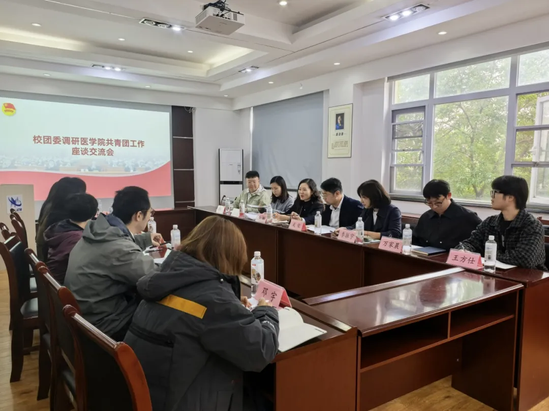 2025年10月31日,校团委到访医学院对学院共青团工作开展调研与交流,校团委书记武俊、团委副书记李娜、校团委青年发展办公室主任李振宇、组织工作办公室主任张敬文,医学院党委书记曾东红、党委副书记于楠、团委书记胡豪、负责学院团委相关专项工作的辅导员老师及医学院研究生会等主要社团学生干部参加会议。