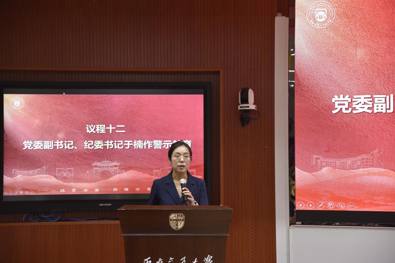 党委副书记、纪委书记于楠结合高校系统典型案例开展了警示教育,通过以案示警、以案明纪,提醒全体党员要严守纪律红线,筑牢思想防线,切实做到知敬畏、存戒惧、守底线。