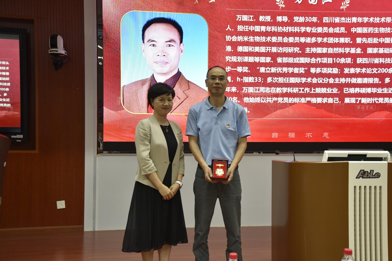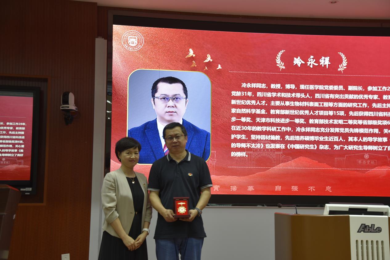 值此迎接中国共产党成立104周年之际,医学院党委特为党龄30年以上的冷永祥、万国江两位同志定制了“光荣在党30年”纪念章,以表达对两位同志在学校、学院发展以及党和国家教育、科研事业中所作贡献的衷心感谢和崇高敬意。党委书记曾东红为两位同志颁发了纪念章。
