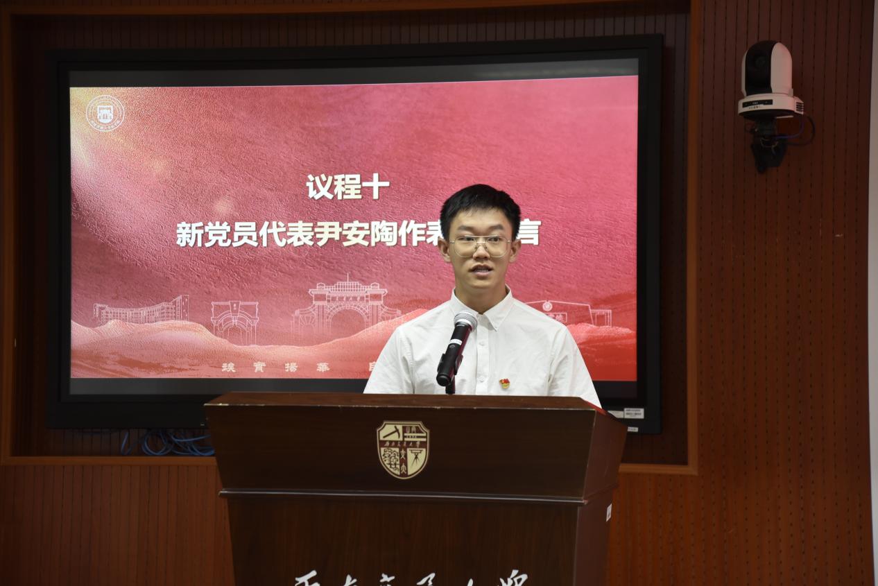 尹安陶同志代表全体新党员进行了“履行党员义务、争做先锋模范”表态发言,承诺要在思想上、服务上、学习生活中争当先锋作表率,并将不断向优秀党员同志们学习,不断在实践中锻炼自己,积极进取,与时俱进。