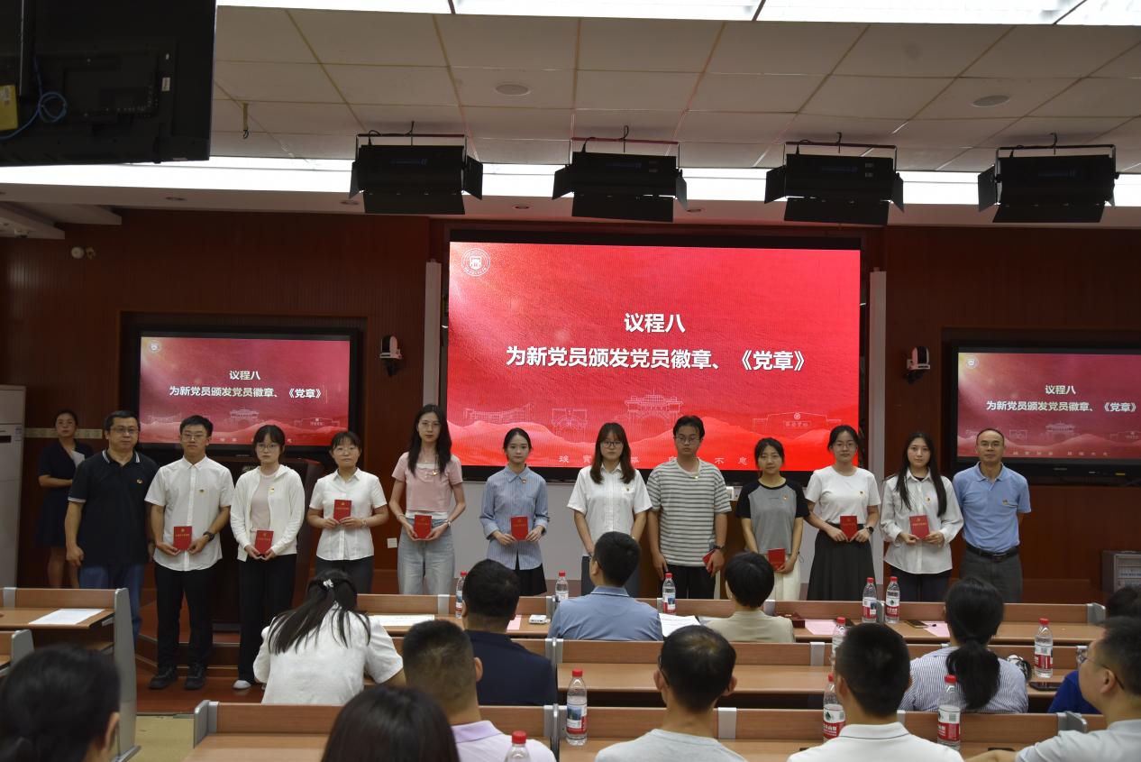 大会第二阶段,举行党员宣誓仪式。党委书记曾东红宣读了《中共星空web版登录入口委员会关于同意接收预备党员的批复》,冷永祥、万国江两位在党三十年的老党员同志为新党员佩戴党员徽章并颁发《中国共产党章程》。